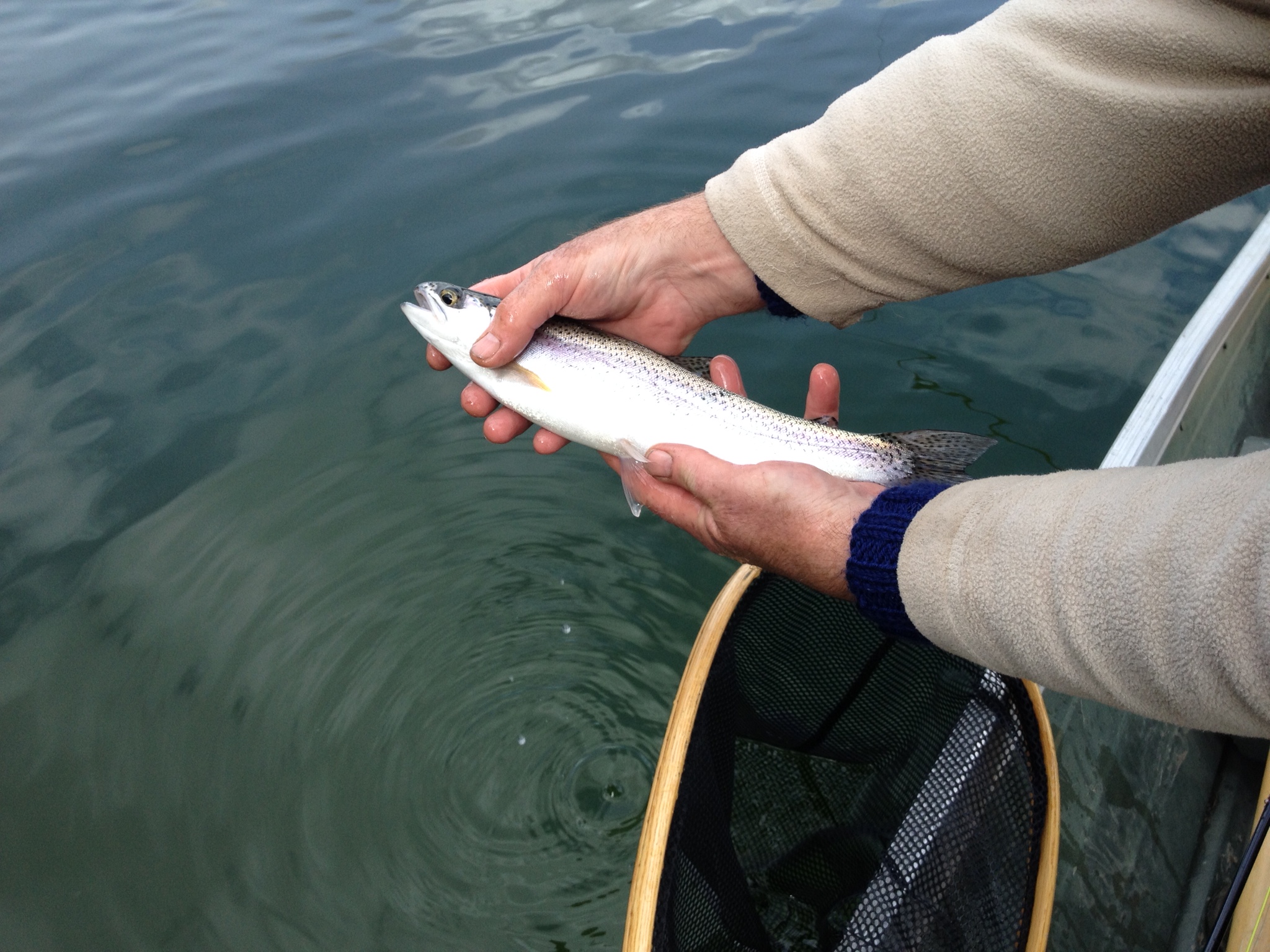 With perfect spring conditions on Ruth Lake, it still tooks us a couple of days of hard fishing to finally find the fish! With the lake just beginning it’s “turnover” finding them was not easy. Though for the most part the sun was shining, we did face some bitter cold wind that chilled to the bone! On day three, we decided to concentrate in the narrows of the North side of Deer Island (an area we have never spent much time fishing in due to lack of success). Trolling a black leech on a sinking line we finally got into them and landed six rainbows over a few hours of fishing. Judging from other boats out on the water over the three days, we were the ones finally pulling them in.