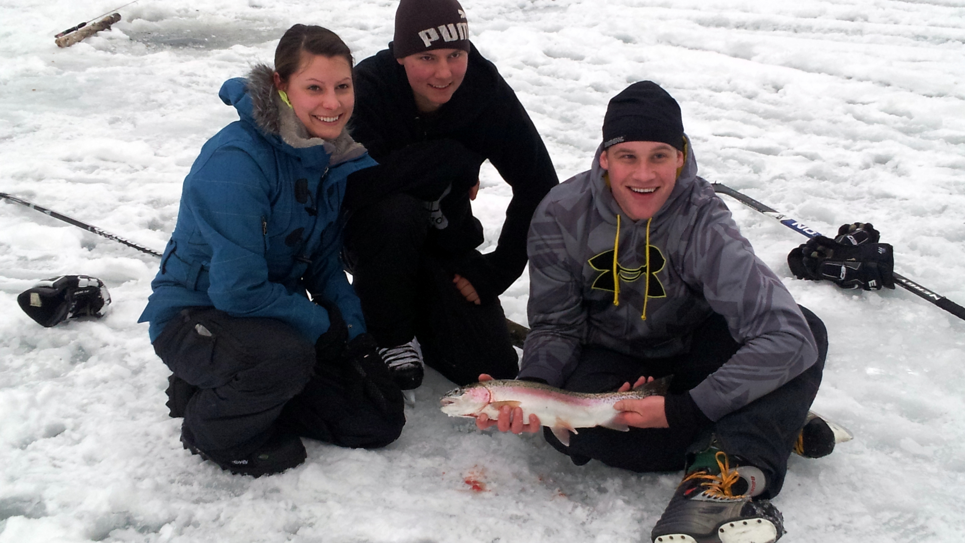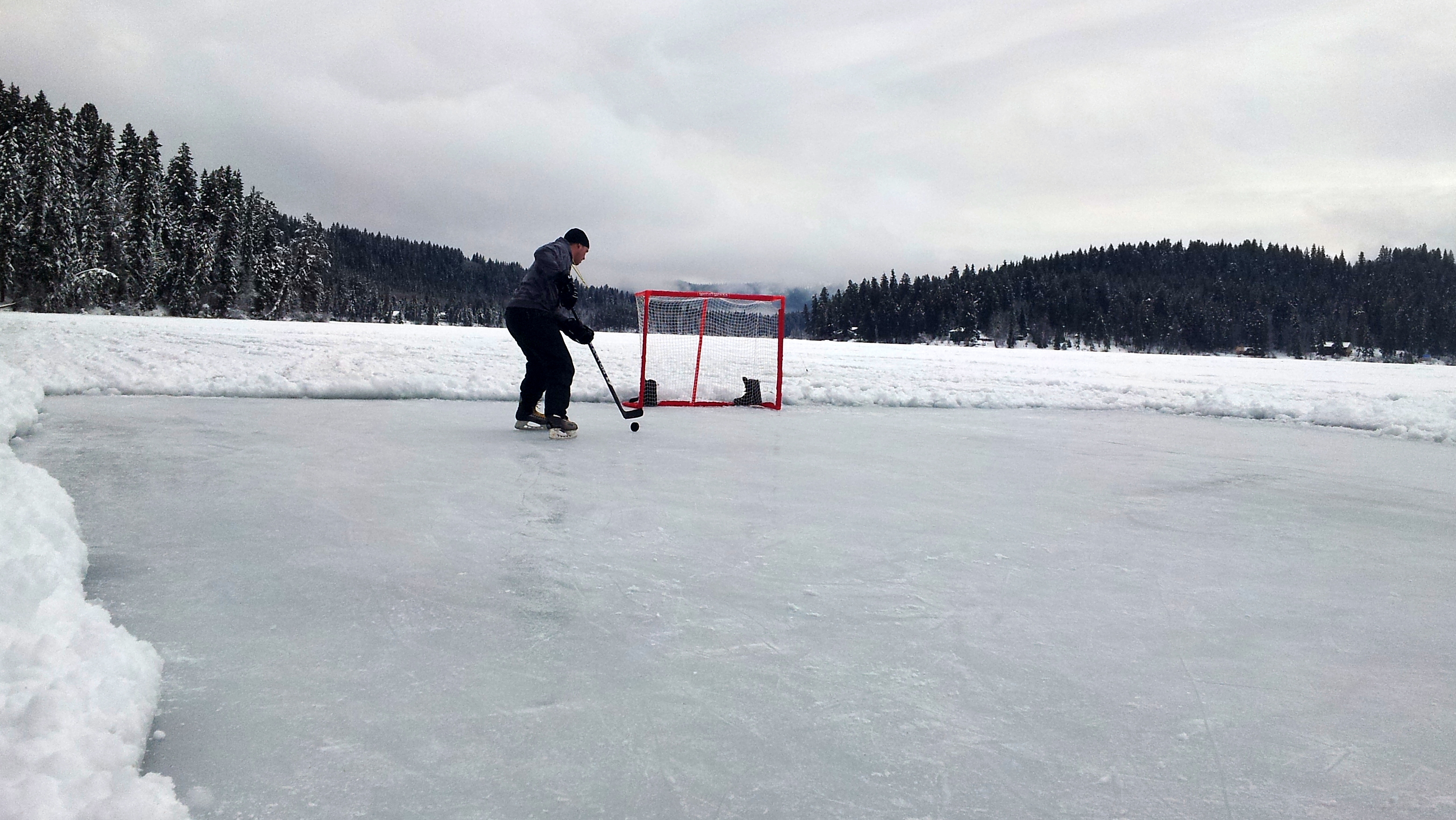 Special thanks to Silver Tip who supplied the snowmobiles to take us to our favorite spot on the lake for ice fishing. The warm conditions on day one and two proved to be ideal for building an ice rink. The ice on the lake was about 12 inches thick and the warm weather and snowfall had produced a three inch layer of slush on top of the ice. The boys worked diligently, pushing off the snow and slush and on day three the -8 weather made it perfect for skating.